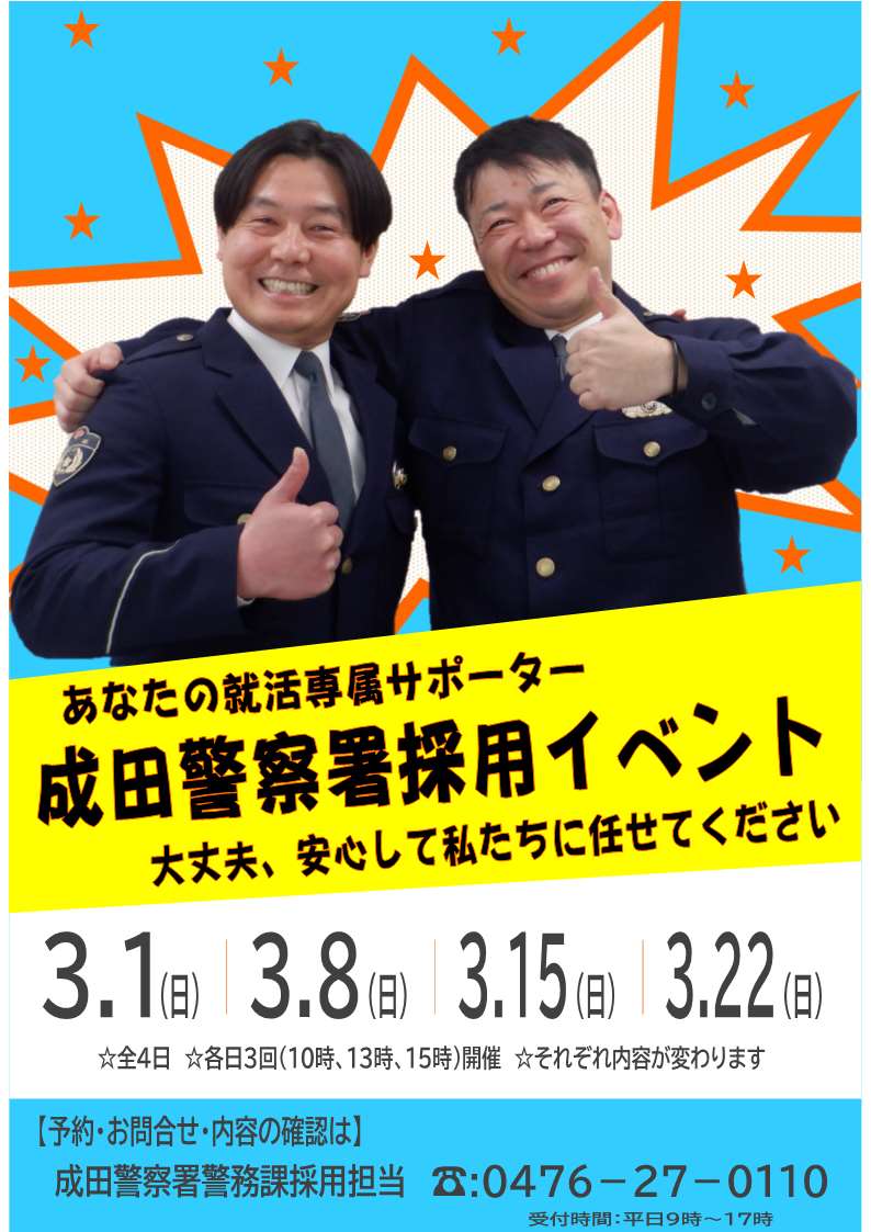 - 成田警察署では随時、採用相談を受け付けております。