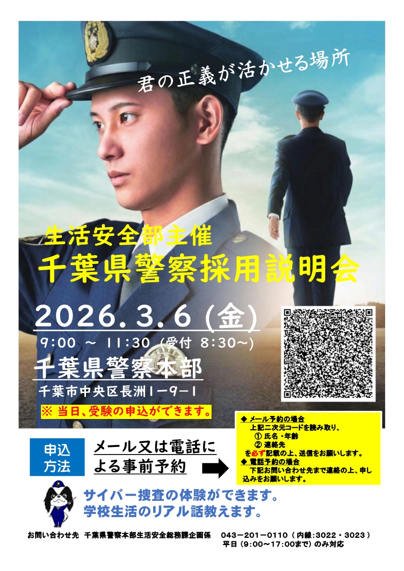 | 千葉県警察本部 警務課 電話番号:043-201-0110 (警察本部代表) |