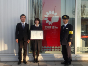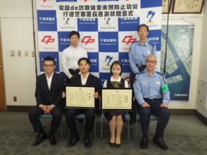 中央労働金庫成田支店次長の今井浩嗣さん、支店長代理の幕田奈穂子さん、職員の山口舞さんは、令和7年6月9日、来店した女性が「知人が来日するために、海外から荷物を送ったが関税で止められてしまったようだ。荷物を受け取るために知人に金を振り込みたい。」などと申し立てたことから、詐欺を疑い、警察に通報していただきました。更に、同月16日、再度女性が来店し「バッグと時計の購入のため86万円を振り込みたい。」などと申し立てたことから、詐欺を疑い、警察へ通報するなどしていずれも被害を未然に防止していただきました。