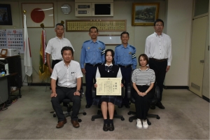 川村さん親子は、令和7年7月4日昼頃、白子町内において、炎天下の中で道に迷い、自宅に帰れなくなっていた高齢女性を発見したことから、女性に声を掛け、警察官に引き渡すなどして、女性の安全確保に貢献していただきました。