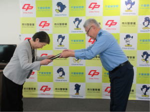 相川署長が、「通報していただいたおかげで、被害を未然に防ぐことができました。ありがとうございました。」と感謝の意を伝えると、大河原さんは「高齢の方が被害に遭わなくて良かった。警察官も迅速に対応してくれたおかげです。」などと感想を述べられました。