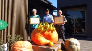鈴木さん、塙さんは、同カボチャの重量「494(よくし)」の語呂合わせにより「犯罪抑止」及び「交通事故防止」を広報し、広く地域住民に防犯意識、交通事故防止の高揚を図り、山武警察署管内の安全で安心なくらしの実現に深く寄与されました。