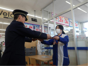 渡邊課長が「被害を未然に防いでいただきありがとうございました。今後もコンビニエンスストアと連携したアシストポリス制度を活用し、詐欺被害を防いでいきたいと思っていますので、これからもご協力をお願いします。」と感謝の意を伝えると、出口さんは「これからも頑張って被害を防いでいこうと思います。」などと感想を述べられました。