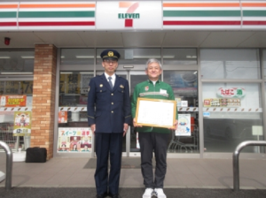 山﨑さん、林さんは、令和7年8月22日、来店した高齢女性が携帯電話を使用しながら店内のATMを操作していたことから、声を掛けたところ「市役所からの健康保険に関する還付金の関係です」などと申し立てたことから、詐欺を疑い、同人を説得しつつ警察へ通報するなどして被害を未然に防止していただきました。