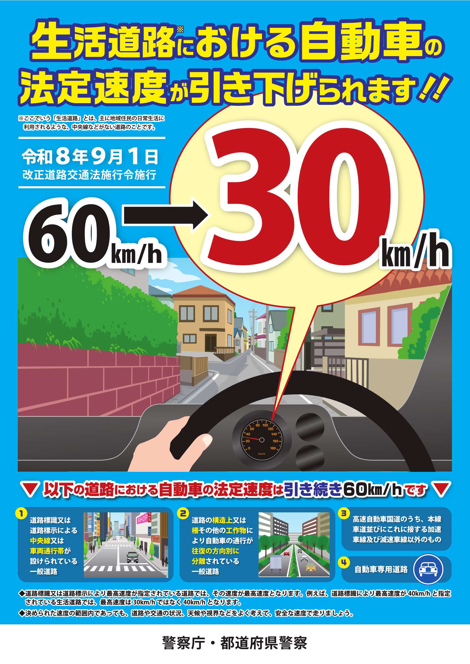 道路交通法施行令の一部改正により、令和8年9月1日から生活道路における自動車の法定速度が60キロメートル毎時から30キロメートル毎時に引き下げられます。(注記)ここでいう「生活道路」とは、主に地域住民の日常生活に利用されるような道路のことです。