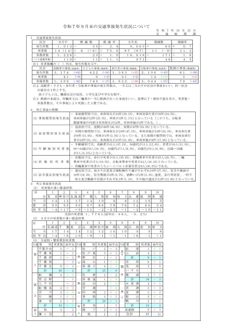 ・ 令和7年9月末現在の交通事故発生状況(PDF形式:389KB)