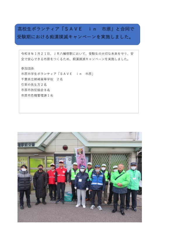 高校生ボランティア「SAVE in 市原」と合同で受験期における痴漢撲滅キャンペーンを実施しました。