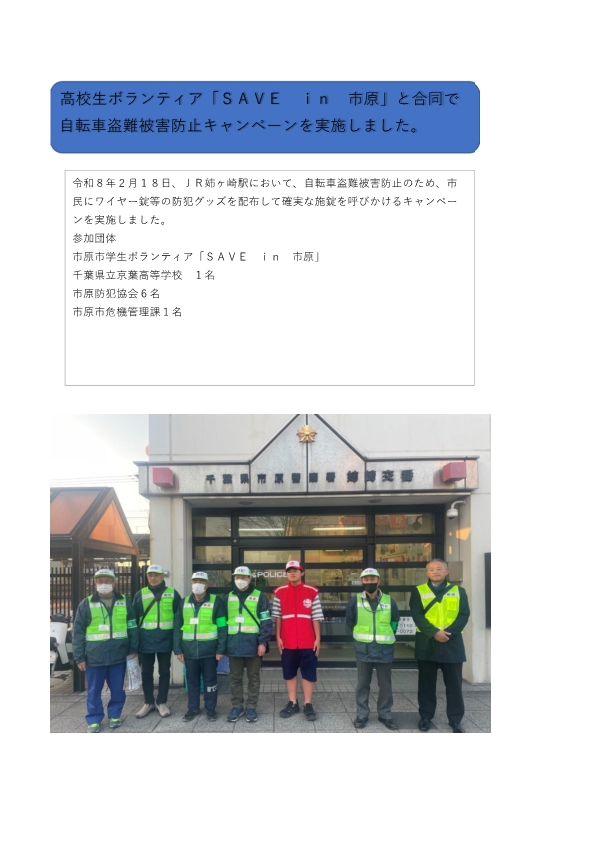 高校生ボランティア「SAVE in 市原」と合同で自転車盗難防止キャンペーンを実施しました。
