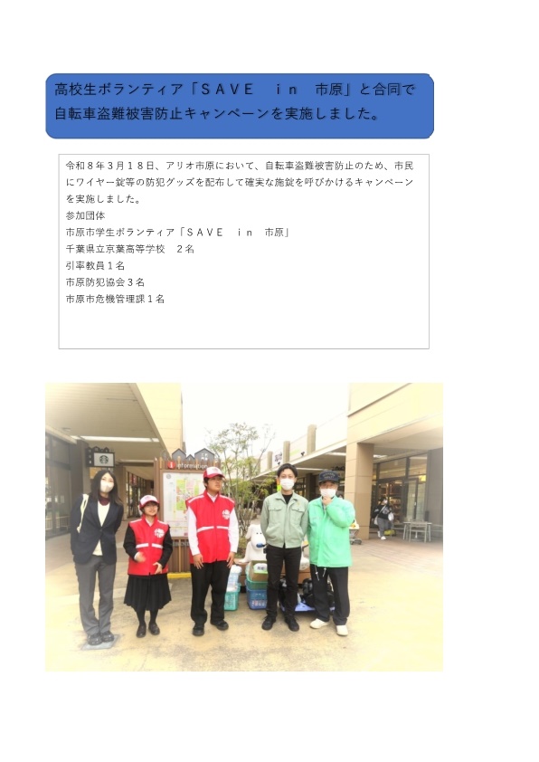 高校生ボランティア「SAVE in 市原」と合同で自転車盗難被害防止キャンペーンを実施しました。