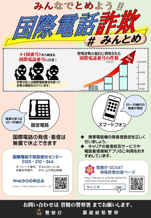 犯人からの電話には、警察本部や警察署と同じ末尾が「0110」の国際電話番号が使われることがありますので、番号のあたまに「+」が付く国際電話番号や知らない番号からの電話には出ないようにしてください。